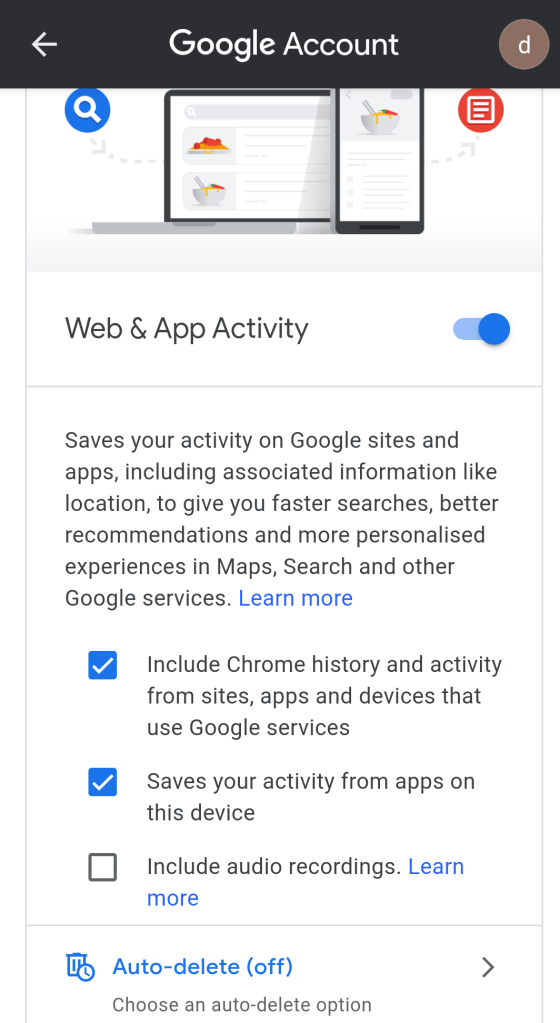 Click on that blue switch and turn off the setting you can also see your past searches and data you can delete your past data immediately if you want after deleting it you can select auto delete option if you don’t want to turn the setting off and change the option to your preference. Same you can do with Location and Youtube History there is one more option at the end of the page Ad personalisation you can turn it off too if you want. After this google won’t gonna track you at all and not gonna keep your data.