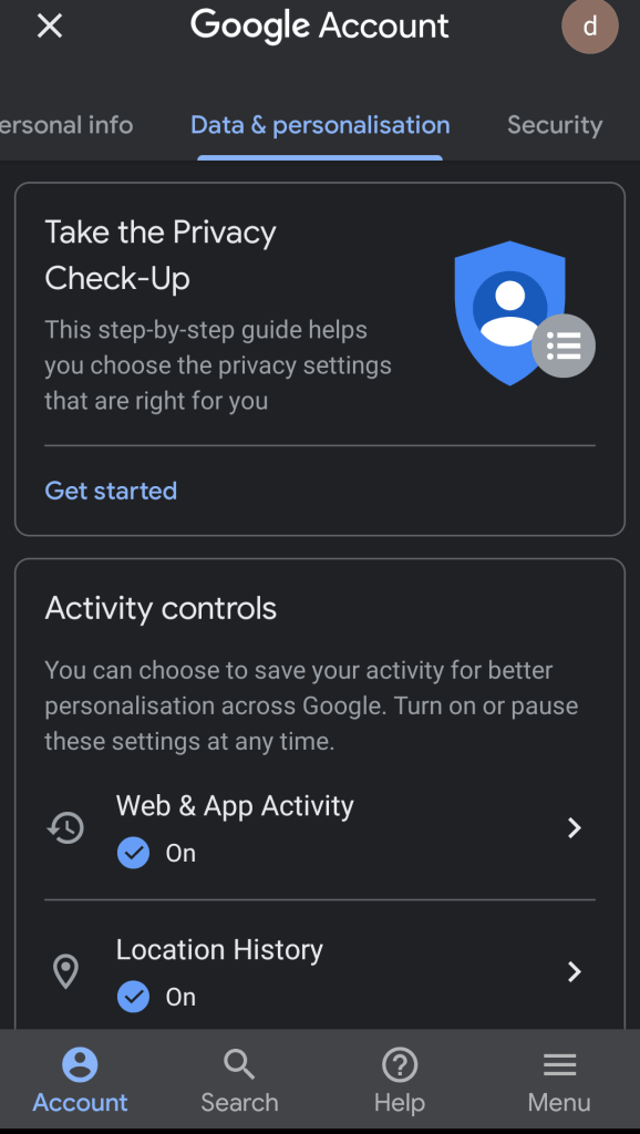 Let’s start if you are logged into your account now just go to Google App present in your android device at top right-hand side you’ll find a circular icon click on that and it’ll pop up and show you your email address and below that you can see written “Manage Your Google Account” click on it and it’ll open a new window of Google account in that you can see many options like Home, Personal info, Data and personalisation etc.